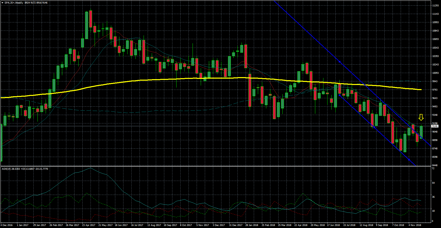 Chart IBEX semanal. El objetivo para el próximo viernes es consolidar la ruptura del canal bajista que ha sido capaz de poner en crisis la tendencia bajista del selectivo español.