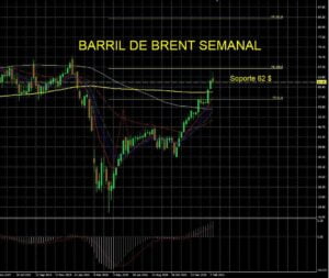 Hoy, puede abrir alcista por encima de MA 50 Sesiones, Resistencia que testaba en el cierre del jueves, y seguir formando el patrón alcista de suelo redondeado. O, por el contrario, no quebrar la Resistencia y darse la vuelta de nuevo hacia abajo. Si se da esta última circunstancia, el soporte de 62 $, dos dólares por encima de las previsiones de hace semanas ( la estimación era de 60$) , puede aguantar el recorte del Barril.