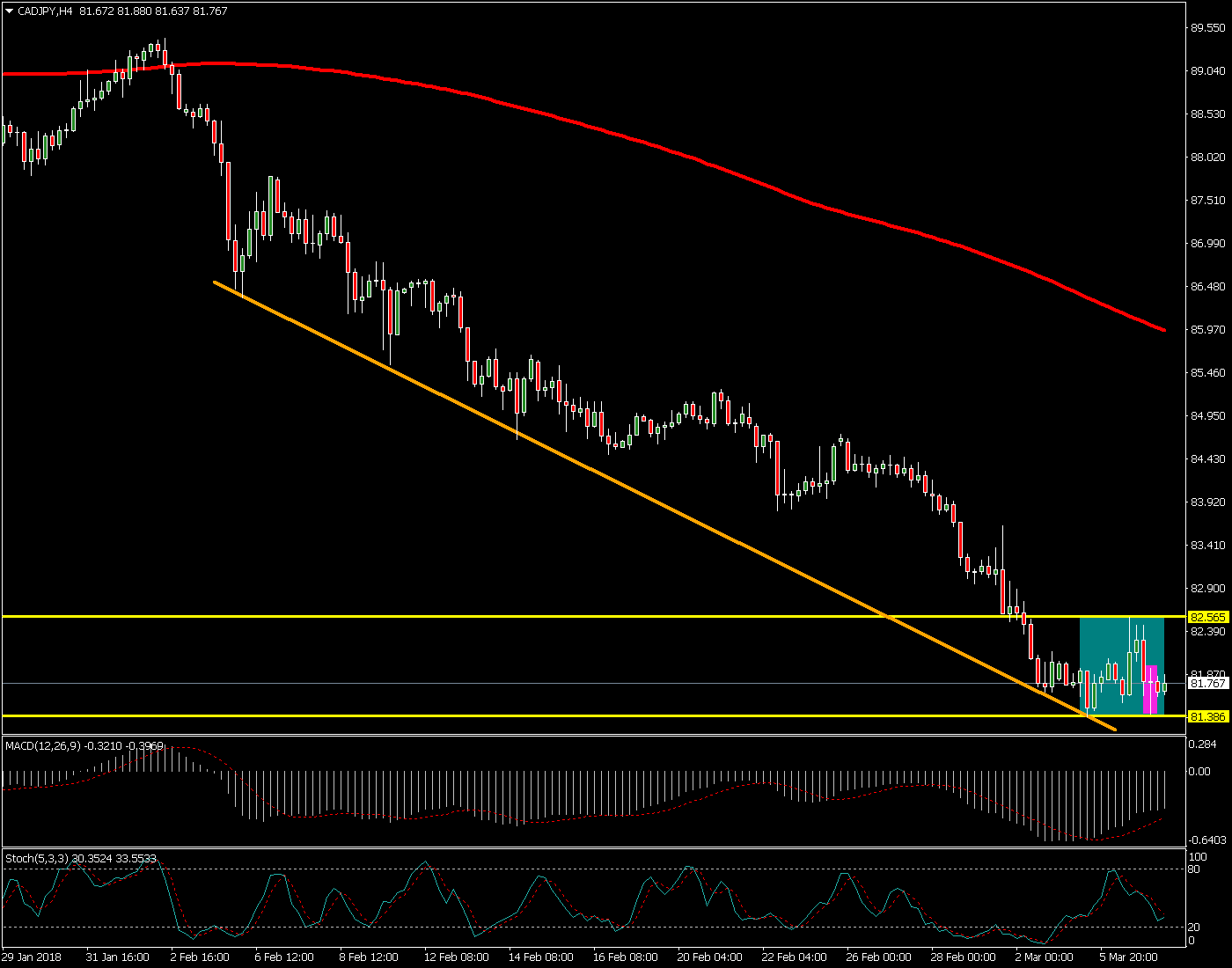 A principios de febrero del 2018 el CAD/JPY rompió el soporte relevante en 0.8670 activando figura tipo doble techo, la cual acabó cumpliendo el pasado 2 de marzo al llegar la cotización al objetivo bajista en 81.80.