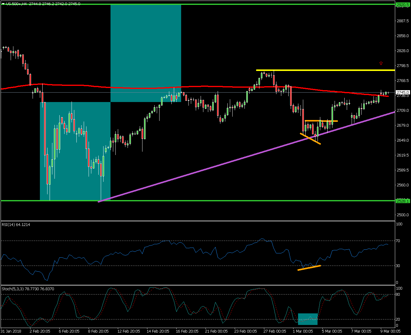 El pasado 2 de marzo del 2018 el índice activó una pequeña divergencia alcista, vemos cómo el precio forma mínimos decrecientes marcados en color naranja mientras que en el oscilador RSI podemos marcar mínimos crecientes. Es una contradicción entre el precio y el oscilador e indica un posible cambio de tendencia, tal y cómo está sucediendo. Luego el oscilador ESTOCÁSTICO estaba en zona de sobre venta cuando se formó dicha divergencia avisando de posible rebote en el muy corto plazo.