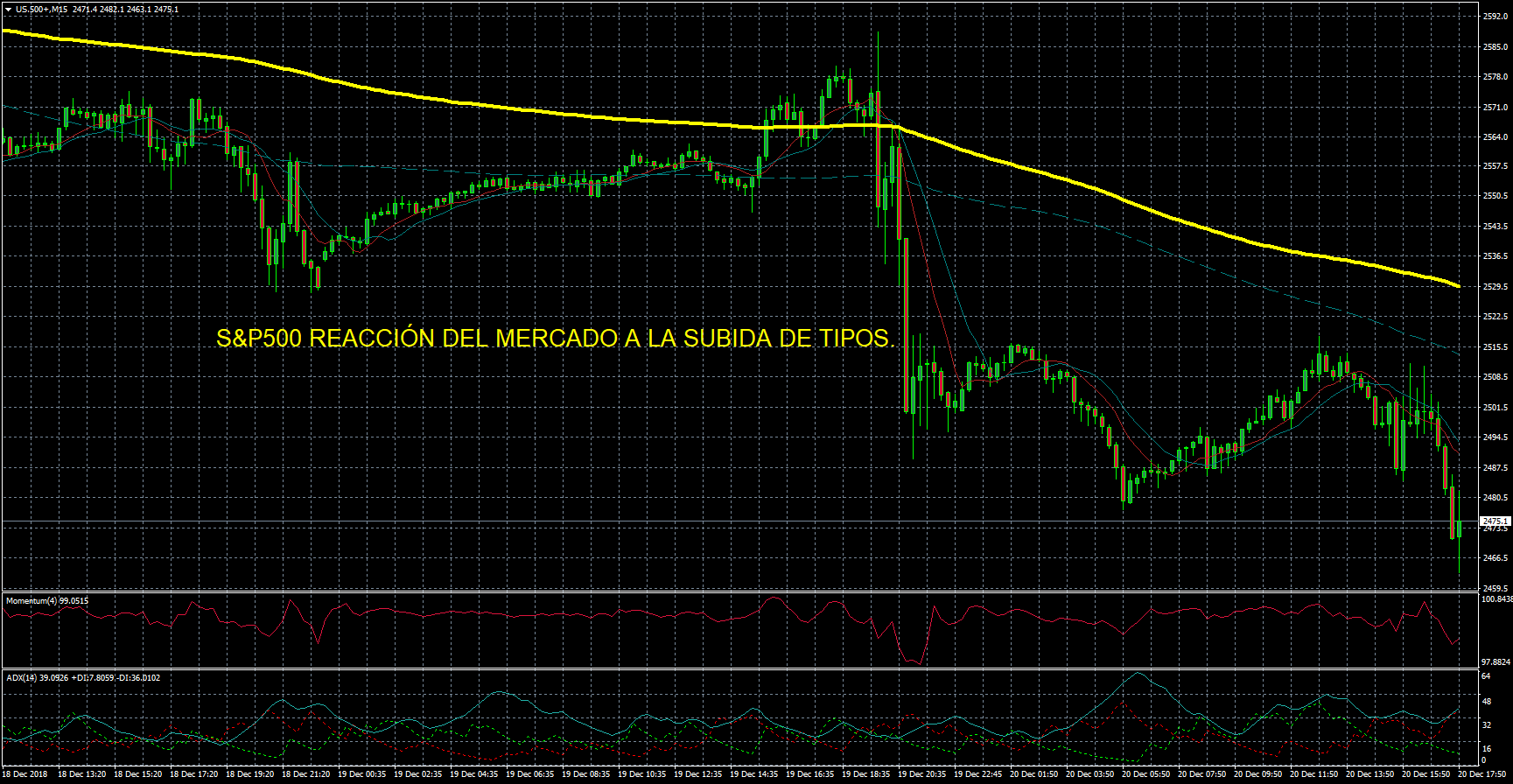 Gráfico S&P500 15 minutos. Se puede apreciar la caída ante la confirmación de la subida de tipos por parte de la FED.