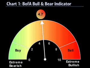 A primera vista los inversores se están calentando y presentan sesgo alcista, como refleja el indicador de Bulls&Bears de Bank of America. Según su lectura entramos en zona de sobre compra pero queda mucho recorrido hasta la sobre compra extrema y el agotamiento alcista posterior a cualquier rally.
