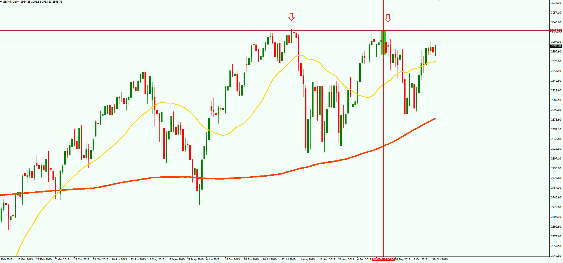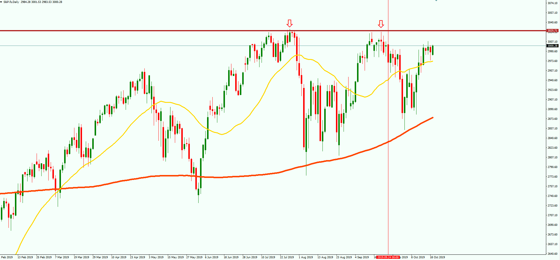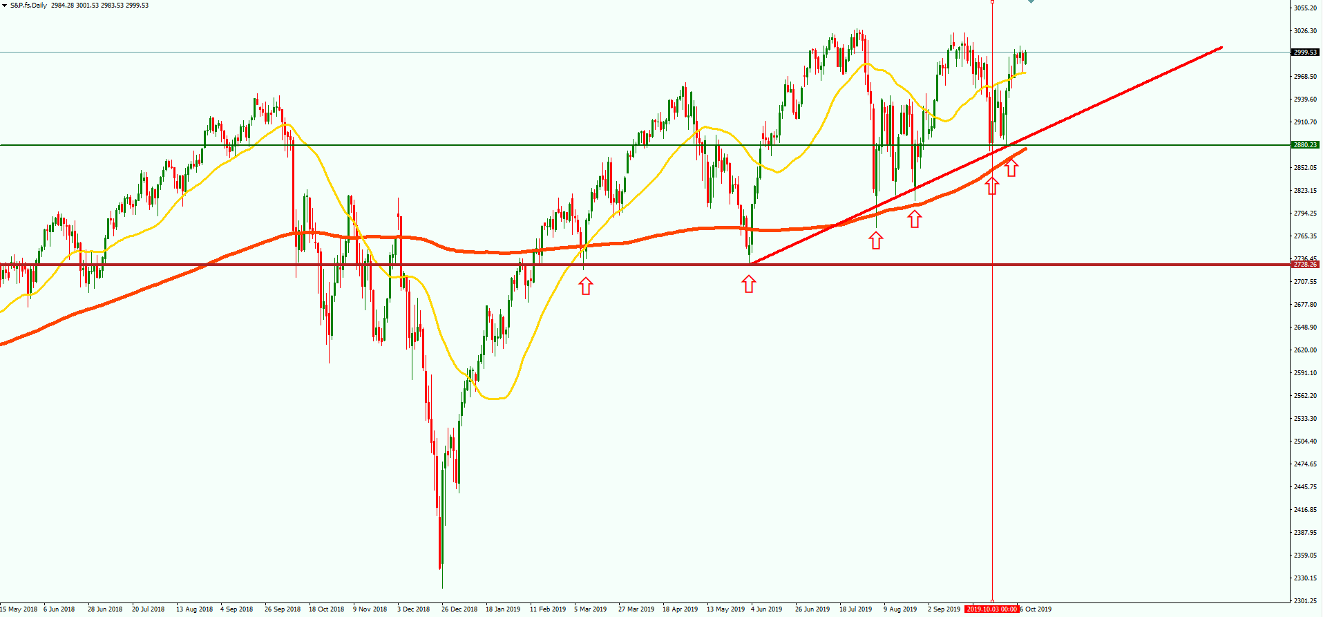 Tras sesiones muy bajistas, coincidiendo con presentación de resultados en el parquet norteamericano, el pasado 03/10/2019 encontró un posible freno en la zona de Media Móvil (Simple) de 200 sesiones (Línea Roja en el gráfico), que posteriormente confirmaría encontrándose y respetando de manera perfecta (Zona 2880, línea verde en el gráfico) la directriz alcista (Línea Vertical roja en el gráfico) formada en diario con más de 4 toques durante todo este año 2019.