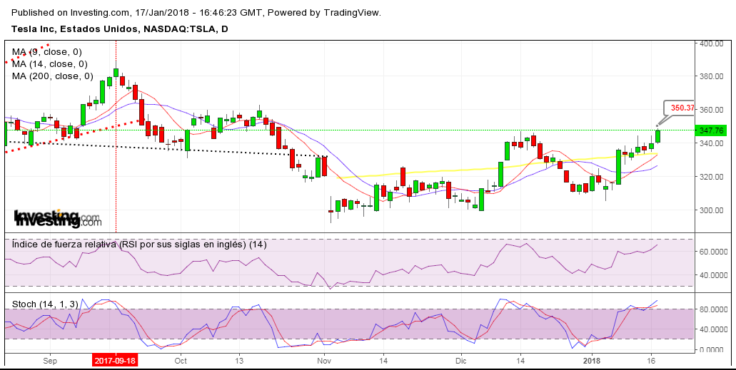 Tras un mes de noviembre y diciembre por debajo de la MA de 200 sesiones, situación a la que llegó esta compañía después de presentar malos resultados en Noviembre, TSLA acaba de cumplir siete sesiones ( hoy 17 de Enero ) de consolidación por encima de la mencionada media en el chart Diario.