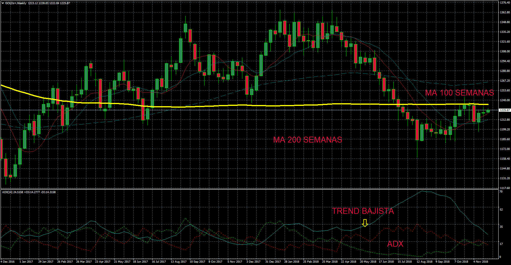 Oro. Tendencia bajista en primavera / verano de 2018 tras romper MA’s de 100 y 200 sesiones.