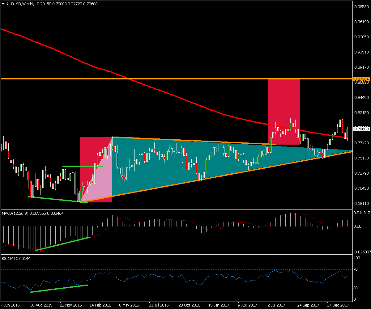 Tras formar la divergencia alcista la cotización ha ido consolidando en forma de un triángulo ascendente señalado en color azul. A principios de julio del 2017 la paridad activaba un posible objetivo alcista por triángulo ascendente roto al alza, con un posible objetivo hacia la zona de los 0.8750, veremos si se acaba cumpliendo en el futuro. Si medimos la distancia desde los mínimos del triángulo hasta la parte alta del vértice y proyectamos esta misma distancia desde el punto de ruptura obtenemos el objetivo alcista.