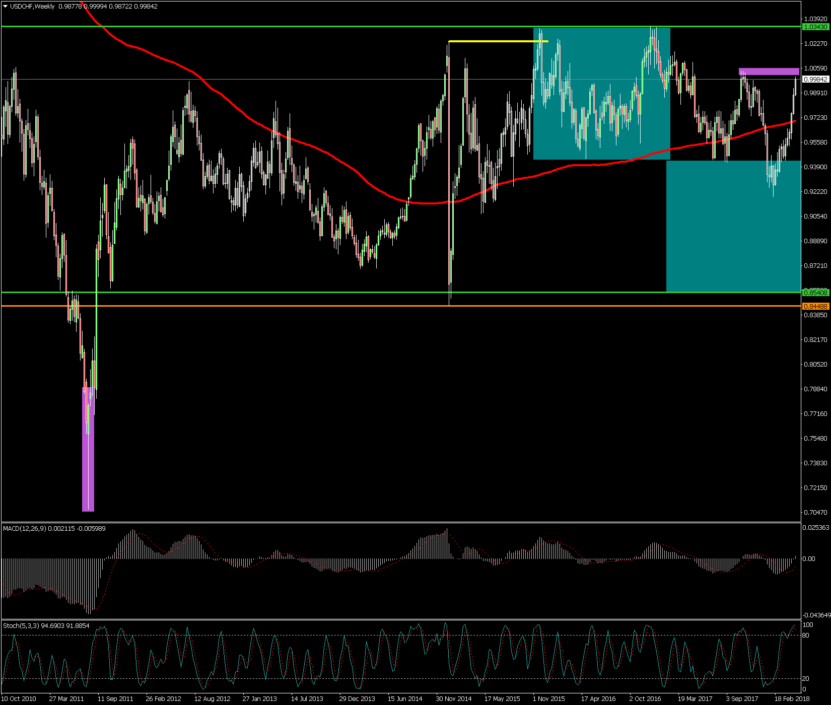 El pasado 3 de septiembre del 2017 el USD/CHF perdió el soporte en 0.9430 activando figura de cambio de tendencia tipo doble techo señalada en color azul, con posible objetivo bajista hacia 0.8540, veremos si se cumple o se anula en el futuro. La figura sólo se anularía de superar los máximos del doble techo en 1.0340.