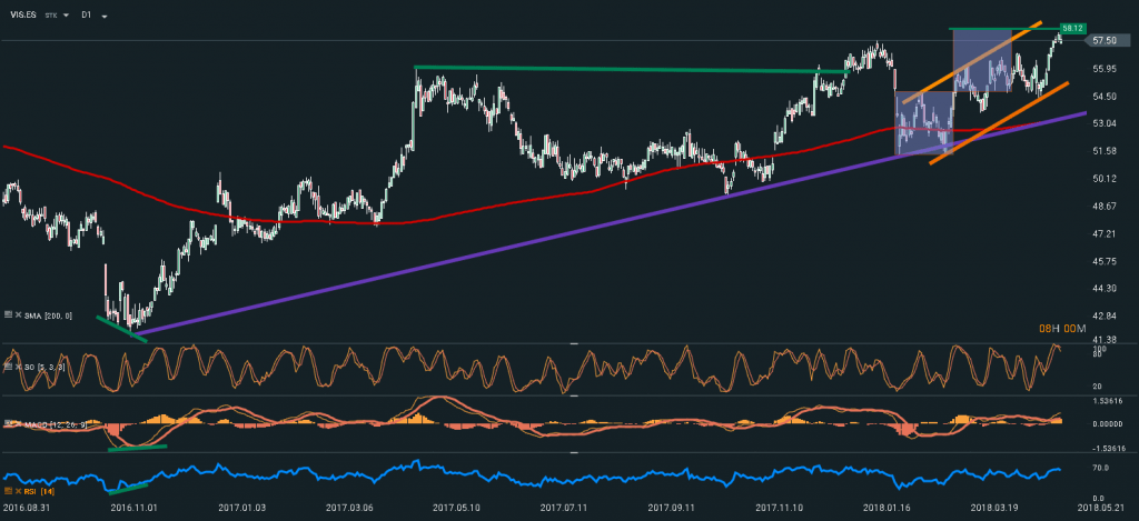 El pasado 9 de marzo del 2018 la acción rompió el nivel de los 54,70 activando figura de cambio de tendencia tipo doble suelo señalada en color azul con posible objetivo alcista hacia la zona de los 58,10, veremos si la termina cumpliendo.