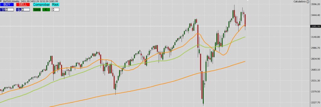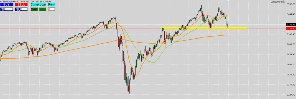 En chart semanal (W1), nos queda un último soporte importante ya mencionado la semana pasada en el que ya actuó en un primer intento de perdida de los 3.000 puntos.