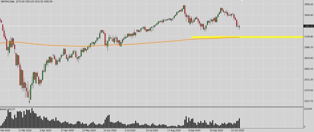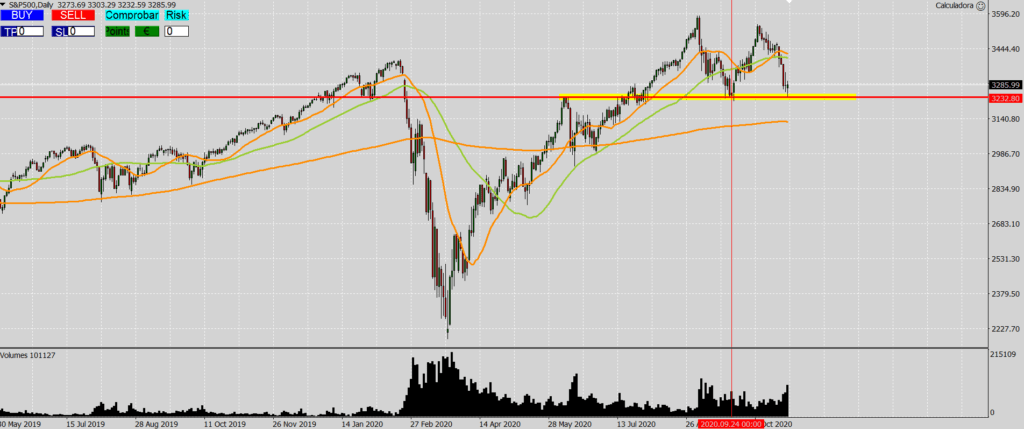 Nuestras previsiones técnicas se han visto muy alteradas respecto al análisis de la semana pasada debido a las noticias negativas viéndose así reflejado en el gráfico, como por ejemplo los comentarios del principal asesor de la Casa Blanca Kudlow sobre que Trump no puede aceptar el plan de ayudas que presenta Pelosi, el mismo lunes 26/10.